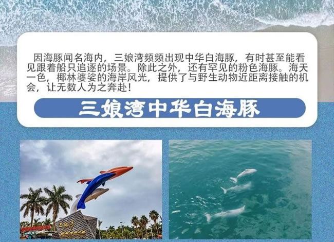 因海豚聞名海內(nèi),三娘灣頻頻出現(xiàn)中華白海豚,有時(shí)甚至能看見跟著船只追逐的 場(chǎng)景。除此之外,還有罕見的粉色海豚。海天椰林婆娑的海岸風(fēng)光,提供了與野 生動(dòng)物近距離接觸的機(jī) ·備讓無數(shù)人為之奔赴!